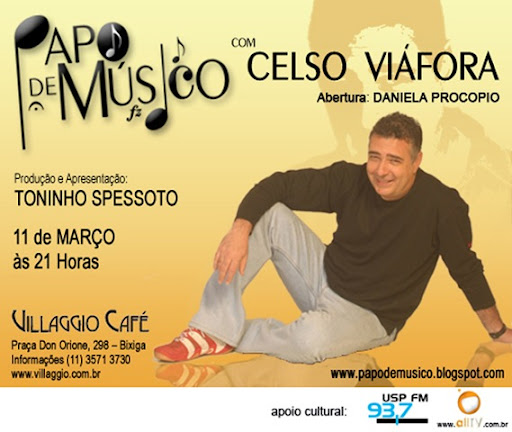 O cantor, compositor, produtor, arranjador e violonista paulistano CELSO VIÁFORA é o convidado do Projeto PAPO DE MÚSICO, que o jornalista, radialista e produtor musical TONINHO SPESSOTO apresenta em 11 de março no Villaggio Café, em São Paulo.
